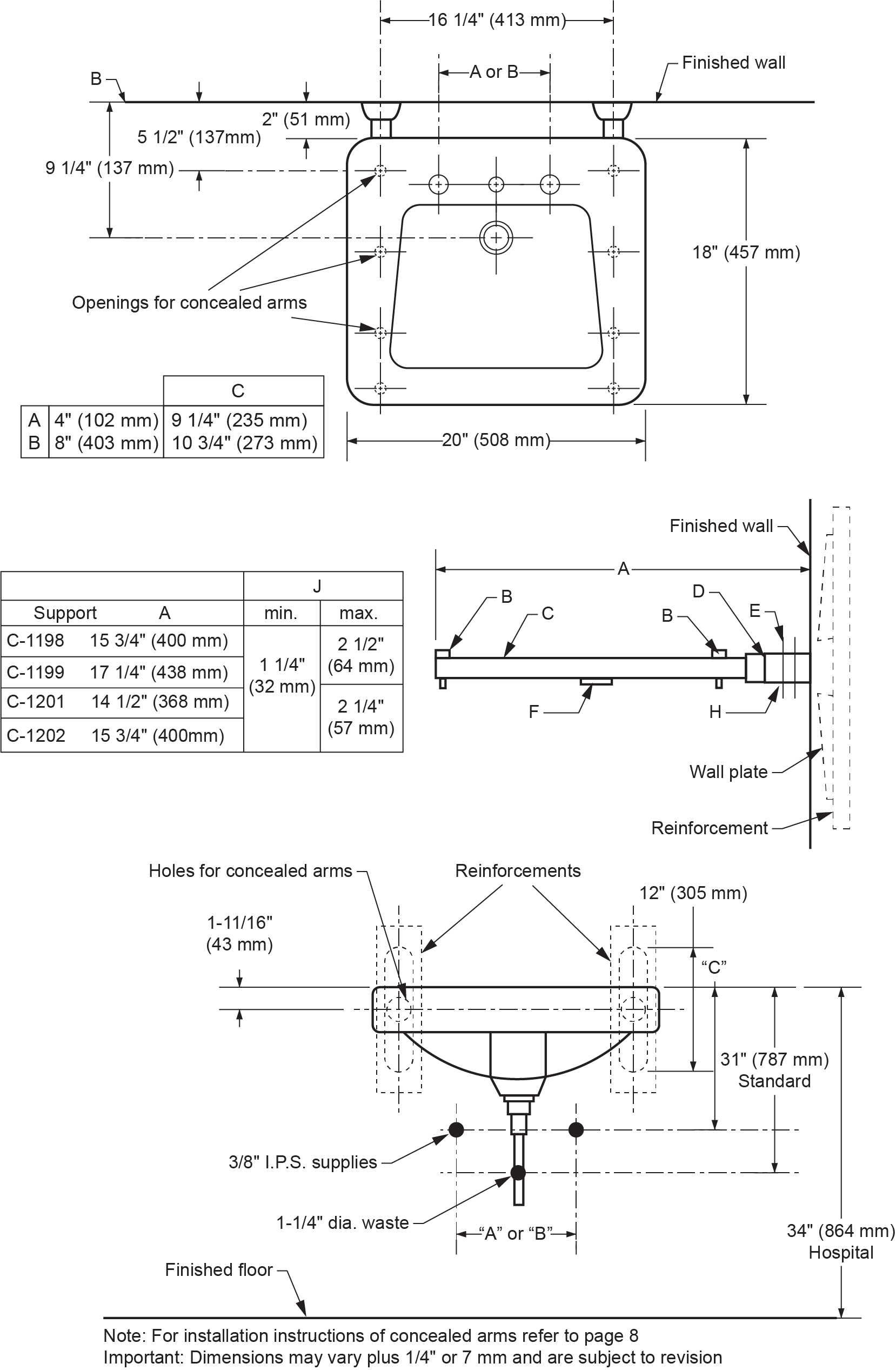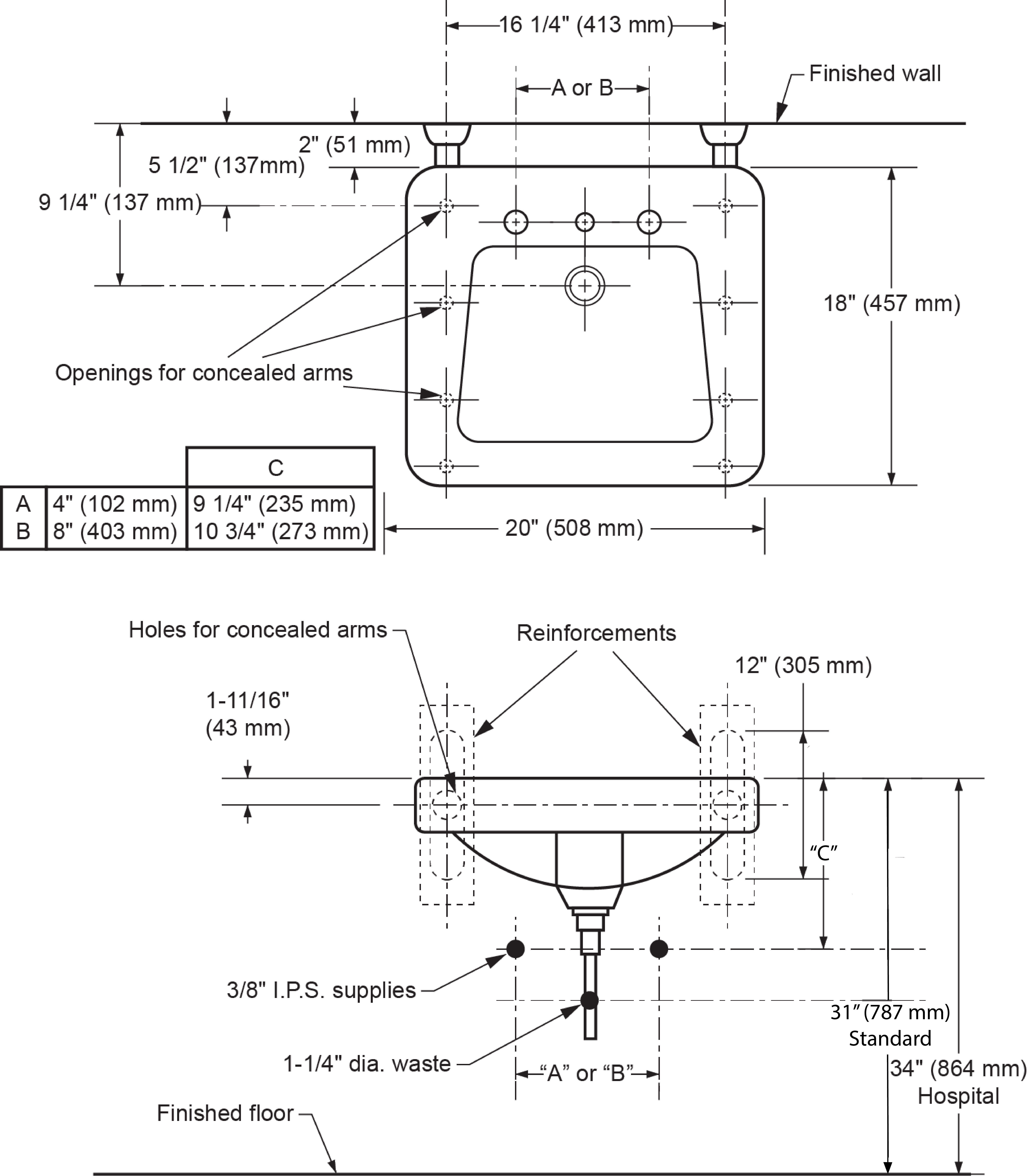When wall-hung lavatories are designed for use by people in wheelchairs, they generally require arm carriers securely bolted to support plates installed in the wall. Figure 13 shows a typical support for plates, the carrier arms, and the rough-in details of the lavatory. The plates must be precisely aligned or the carrier arms will not fit into the holes cast into the sides of the lavatory.