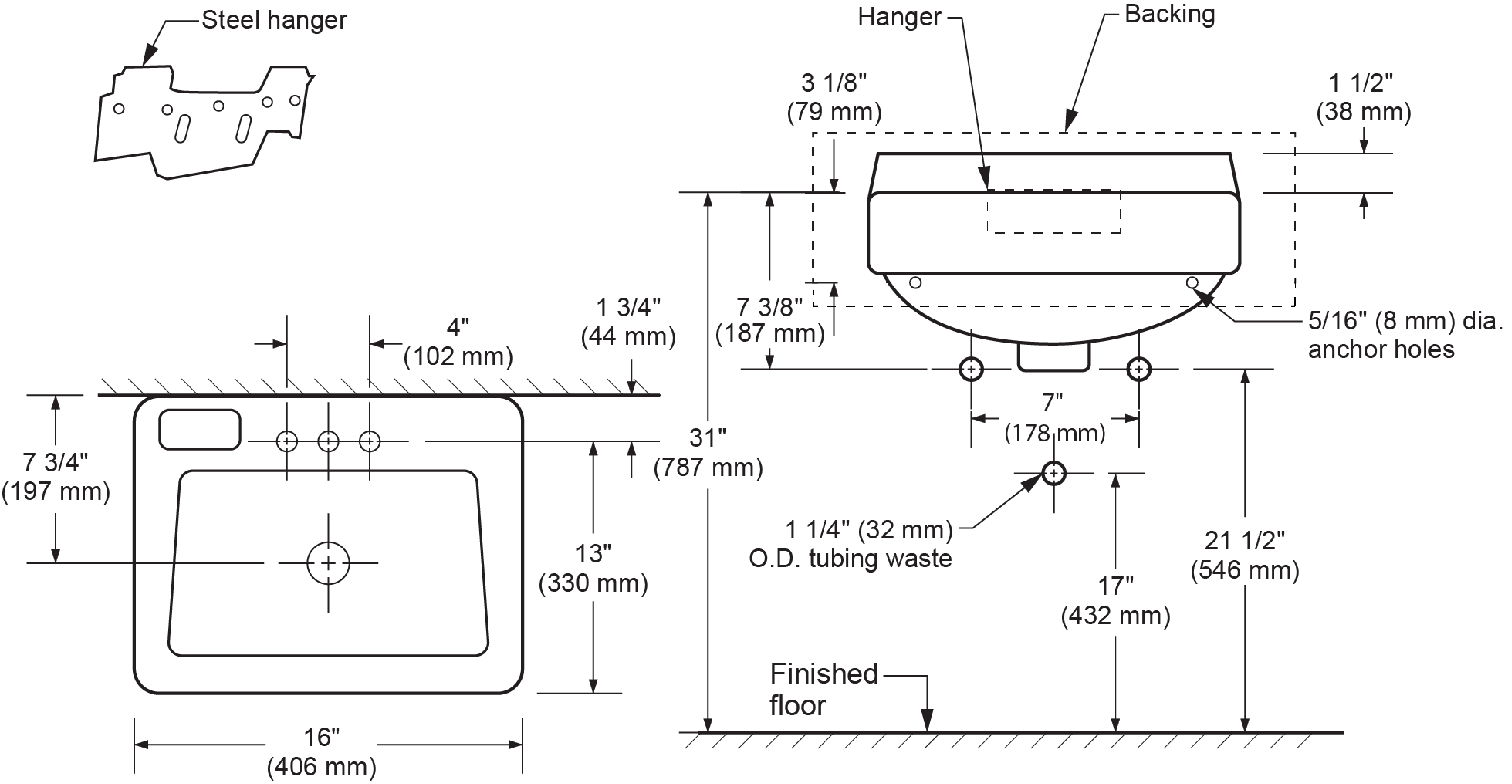 Figure 12 shows a plan view and front elevation view. The waste piping, with a minimum [latex]1\tfrac{1}{4}[/latex] in. (32 mm) diameter, and its position at 432 mm (17 in.) above the finished floor are clearly indicated. The water supply lines are shown at a distance of 546 mm ([latex]21\tfrac{1}{2}[/latex] in.) above the finished floor.