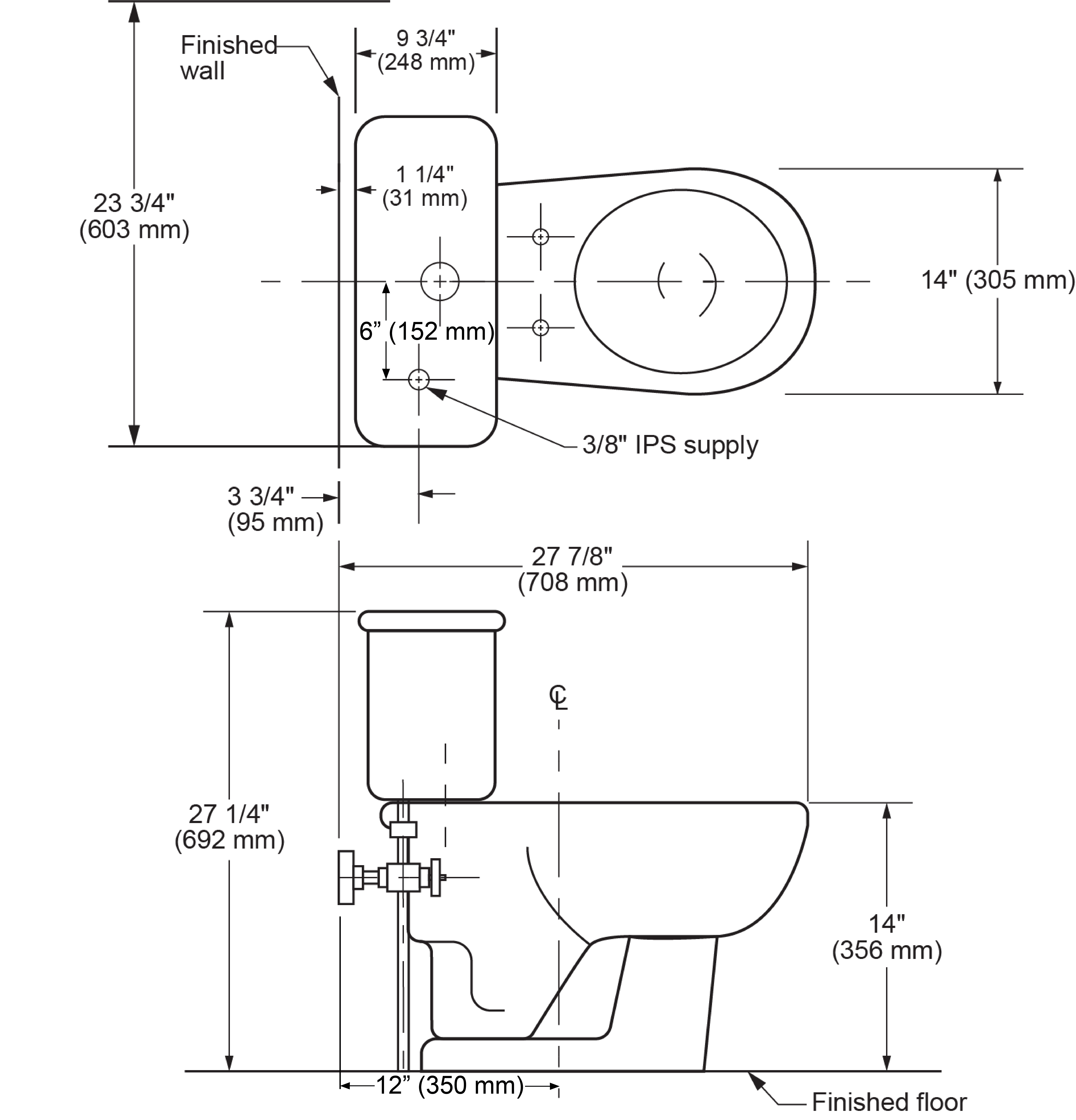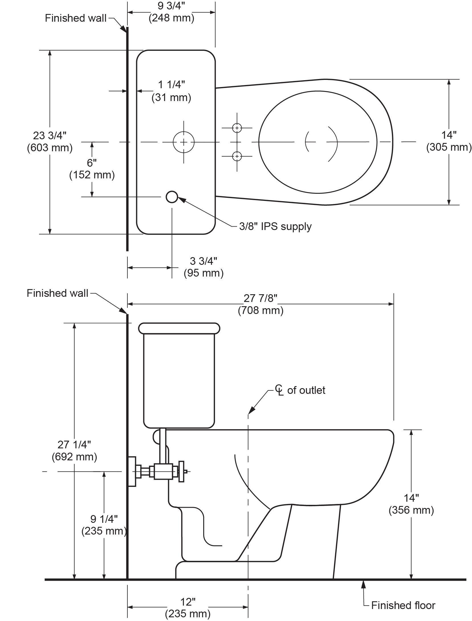 Rough-in documents contain all the rough-in information required to install a range of fixtures. Figure 9 shows rough-in specifications for a standard water closet. Notice that the plan view and front elevation provide the dimensions necessary to install the closet flange and ensure that the water supply line protrudes through the wall at the correct height and horizontal position. These dimensions are common for most standard styles of water closets; the centreline of the closet flange is approximately 305 mm (12 in.) from the finished wall, and the supply line is located 152 mm (6 in.) to the left of the centreline of the flange.