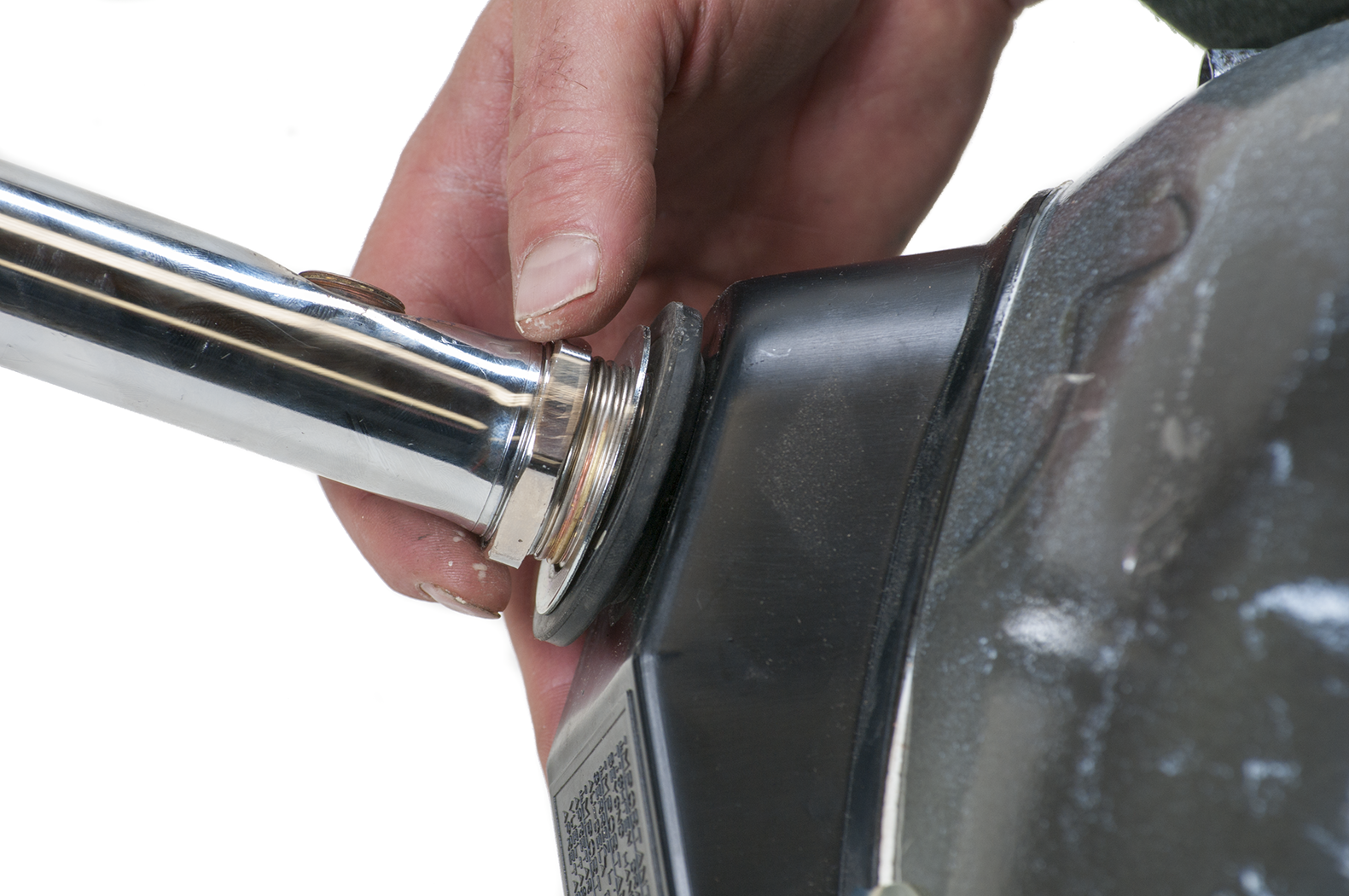 Figure 16 Insert drain plug fitting. (Skilled Trades BC, 2021) Used with permission. - Hold the drain plug fitting firmly in place with one hand. With the other hand, place the gasket, washer, and locknut onto the threaded end of the plug. Tighten the locknut firmly by hand (Figure 17).