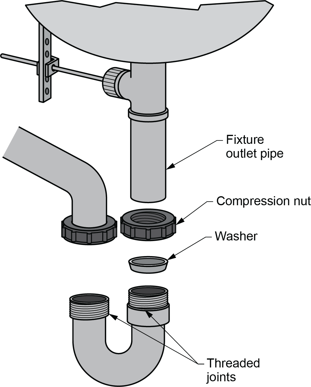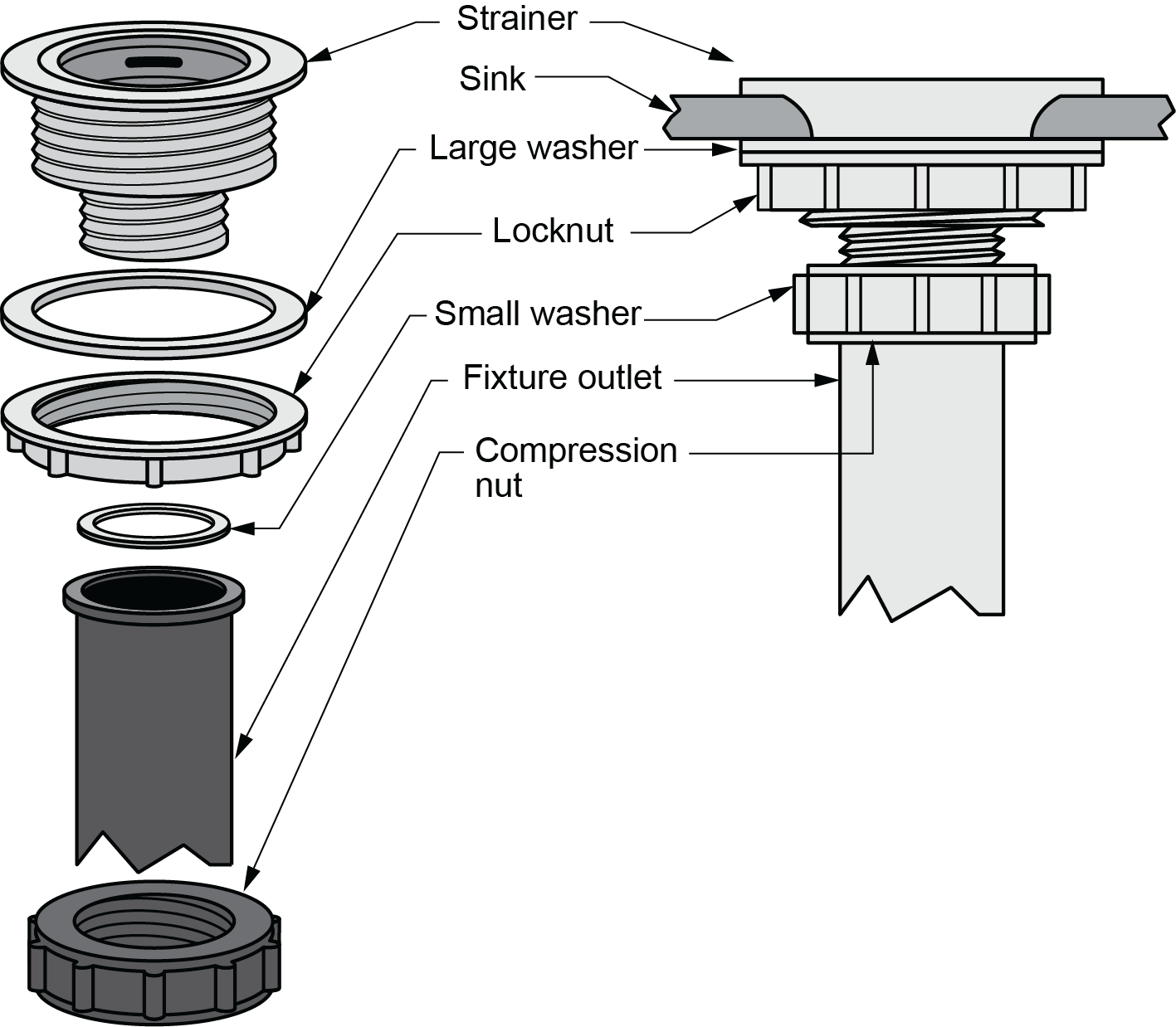 - Connect the fixture outlet pipe to the P-trap and drain piping. For a two-compartment sink, a continuous waste should be connected to the fixture outlet pipe and the trap with [latex]1\tfrac{1}{2}[/latex] in. (38 mm) slip nuts and bevelled washers.