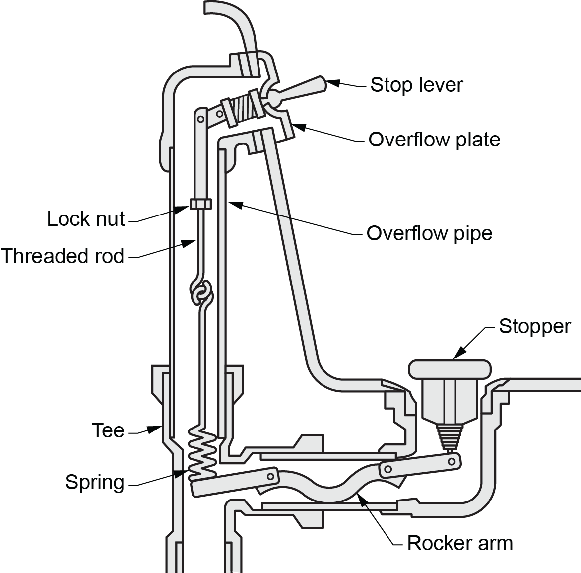 A drain mechanism with a pivot rod that allows the stopper to be raised or lowered using a lift rod. (Section C-1.2)