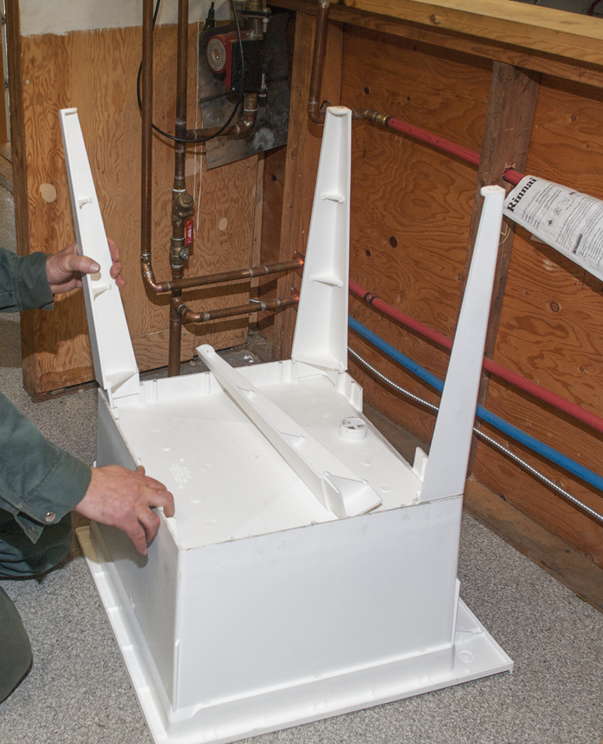 Washing machines require a 5 cm (2 in.) P-trap and a minimum 600 mm (24 in.) standpipe. A standpipe is a vertical section of pipe that extends above the trap weir and must terminate above the flood level rim of the clothes washer. The drain hose from the washer empties into the top of the standpipe during the washer discharge cycle. Laundry boxes (Figure 6) can simplify the installation and provide a neat appearance.