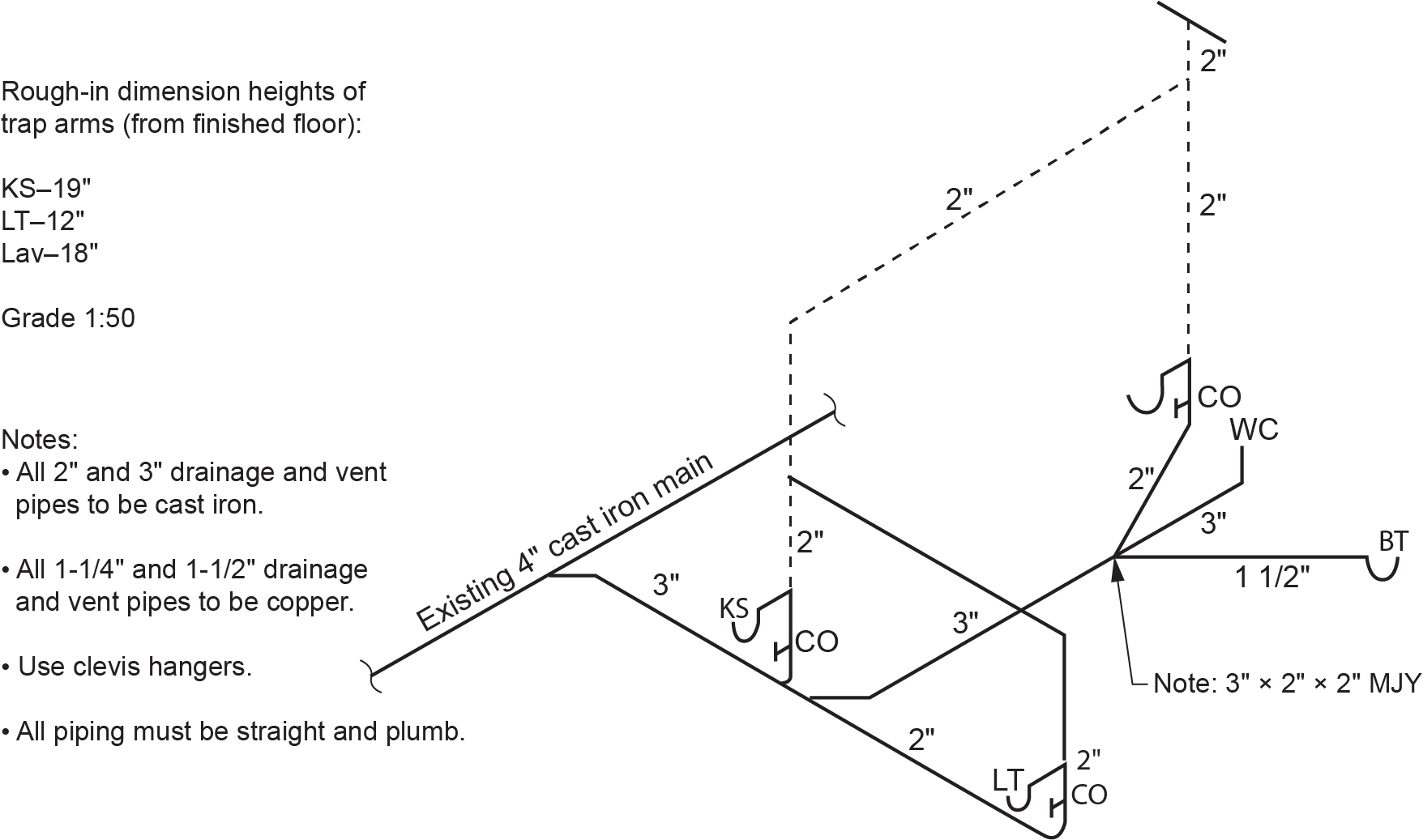 These drawings all provide pieces of information that are critical to accurate rough-in work. However, the plumber may also require more detailed information about the type and size of piping and fittings and how they will travel throughout the structure. An isometric or piping layout drawing may be available, or the plumber will have to prepare one from the information supplied by the architect. Piping isometric drawings, as shown in Figure 8, also show the connections between piping, the path of travel (both inside the wall and under the finished floor), and where piping will connect to fixtures.
