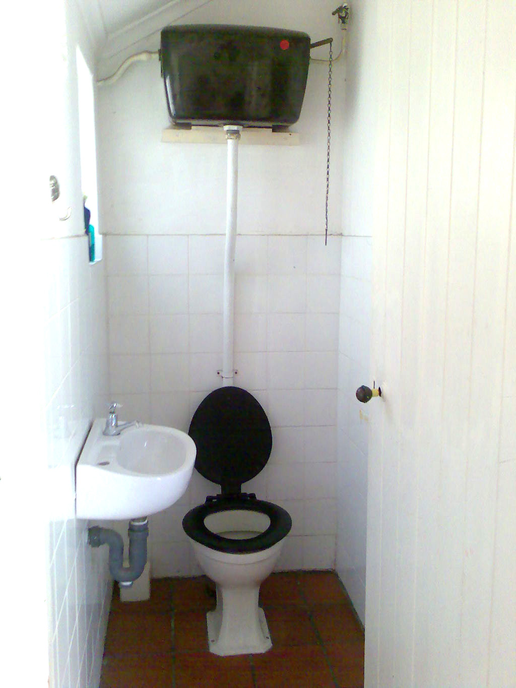 floor-mounted, bottom outlet, high tank water closet with visible flush pipe and chain.