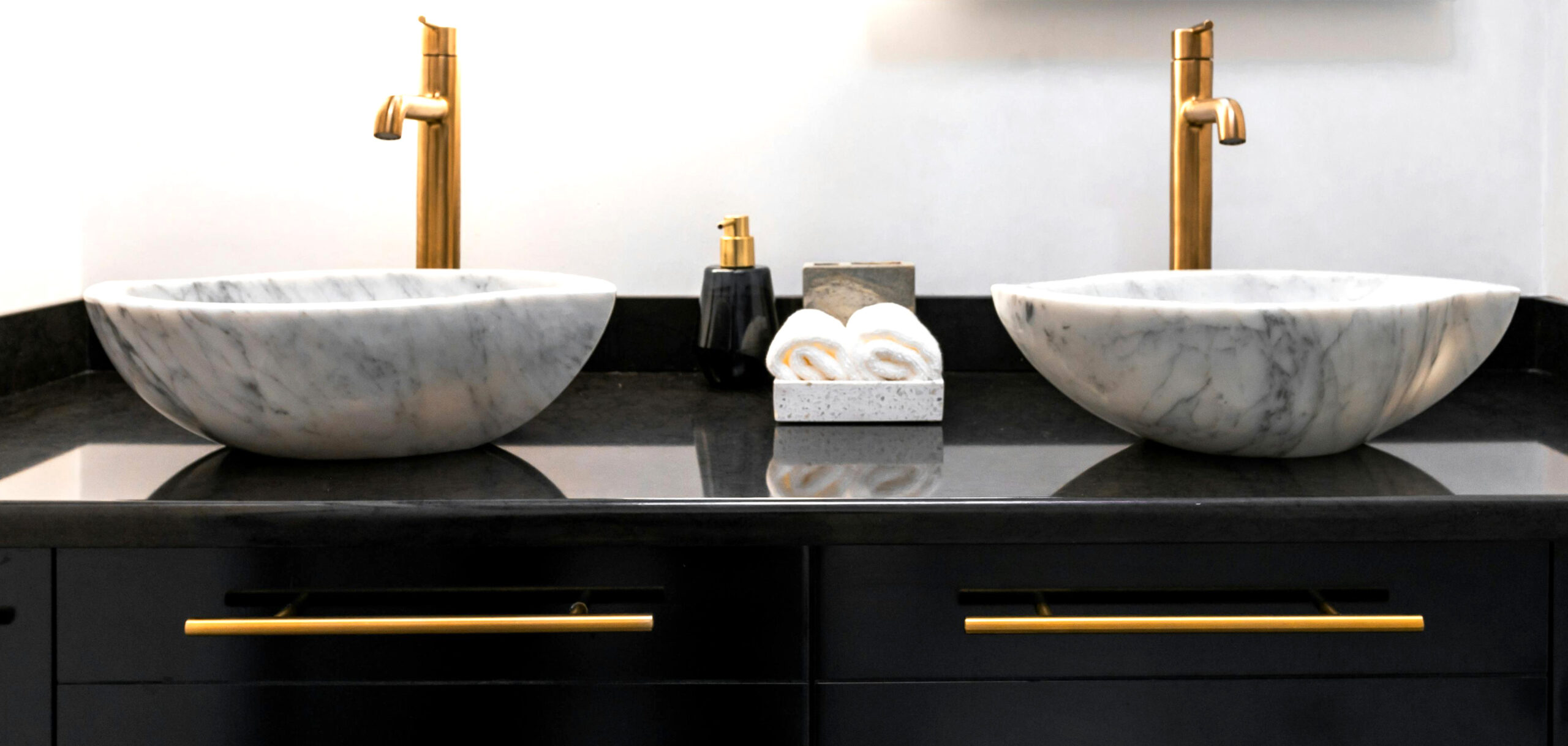 two marble vessel sinks, side-by-side, on a black vanity with gold-colored faucets