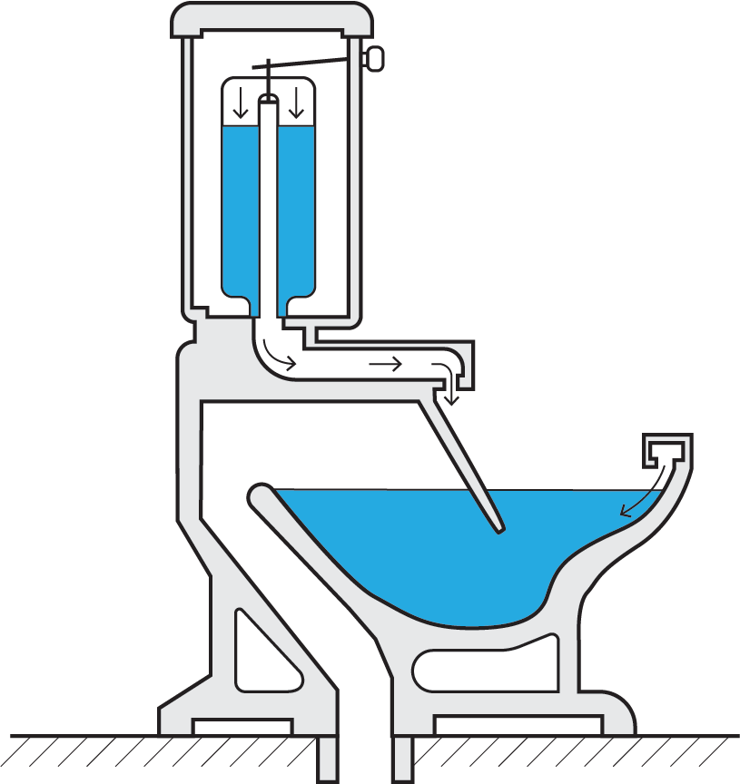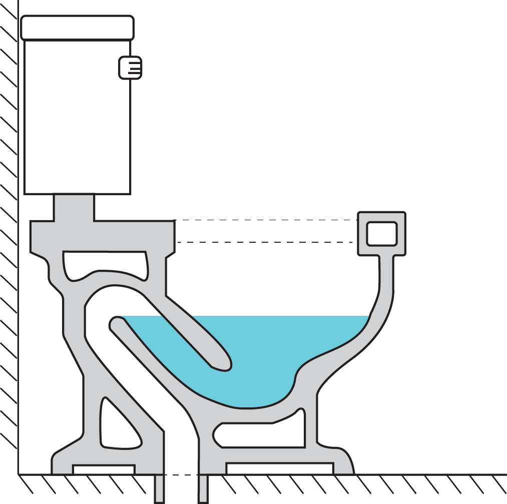 Standard siphon jet water closets function by evacuating the contents of the bowl with jets of water combined with a siphoning action (Figure 13). When water flows from the tank though the rim jets, standing water in the bowl rises, filling the elongated S-shaped siphon waterway. This starts the toilet’s siphonic action, pulling nearly all of the water and waste down the drain. When most of the water is drained out of the bowl, the siphon is broken, and you may hear its characteristic gurgle at the end of the flush. There may also be an additional jet about 2.5 cm at the bottom of the bowl to create more flushing inertia.