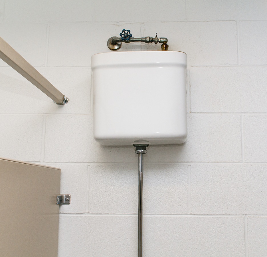 Historically, water-closet tanks were mounted high above the bowl (Figure 9). This assisted in creating head pressure to flush the fixture. A chain allows the user to activate the flush valve in the tank. The tank and bowl are connected via a flush pipe and flush elbow that direct water from the tank down toward the bowl.