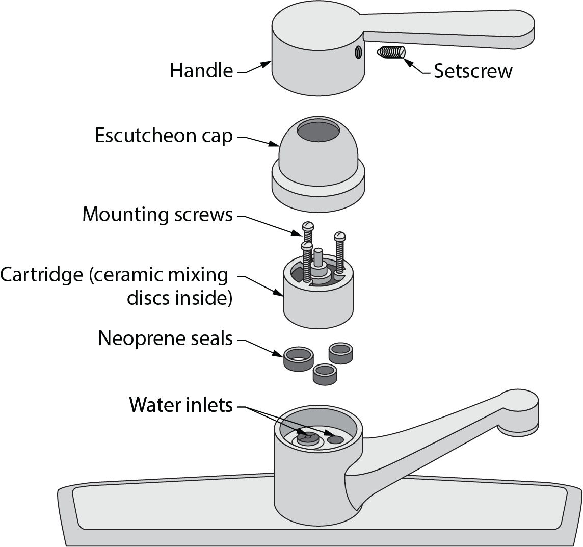 Ceramic disk faucets (Figure 68) have two fire-hardened ceramic disks — an upper one that moves and a fixed lower one. One disk moves against the other in a shearing action, blocking water or allowing it to pass through. The seal between the two disks is watertight because they are polished to a near-perfect flatness. Ceramic disk faucets were first made popular by high-end European faucet makers and are now produced by many North American faucet manufacturers.