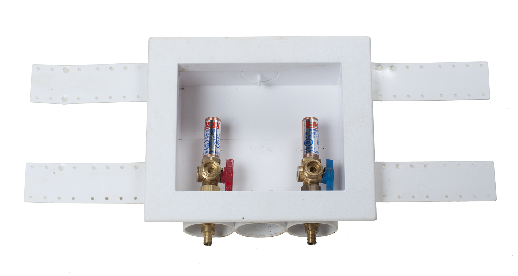 Laundry boxes (Figure 76) supply a set of hot and cold hose bibbs, often a 2 in. (50 mm) NPS drain connection for the laundry standpipe, and are available with built-in water hammer arrestors. Laundry boxes enable the standpipe and water lines to be concealed, providing a clean look to the installation. The clothes washer hoses are connected to the hot and cold supplies and the discharge line is placed into the drain inlet of the box.